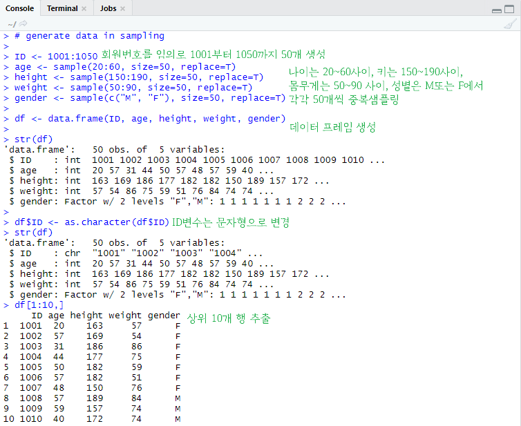 샘플링은 sample(샘플링 할 값의 범위, size=샘플링 할 개수, replace=T or F (중복추출 여부)) 로 할 수 있다.