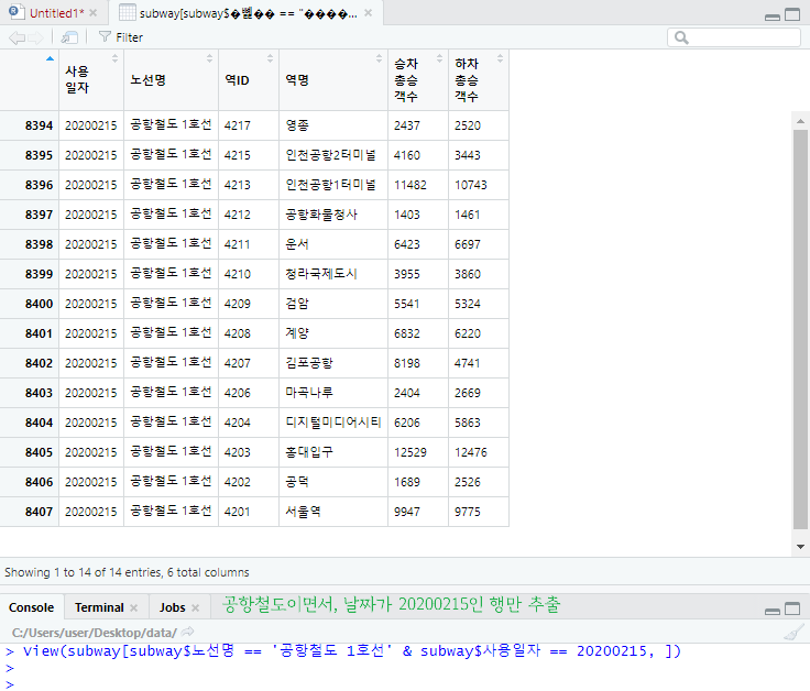 View(subway[subway$노선명 == '공항철도 1호선' & subway$사용일자 == 20200215, ])