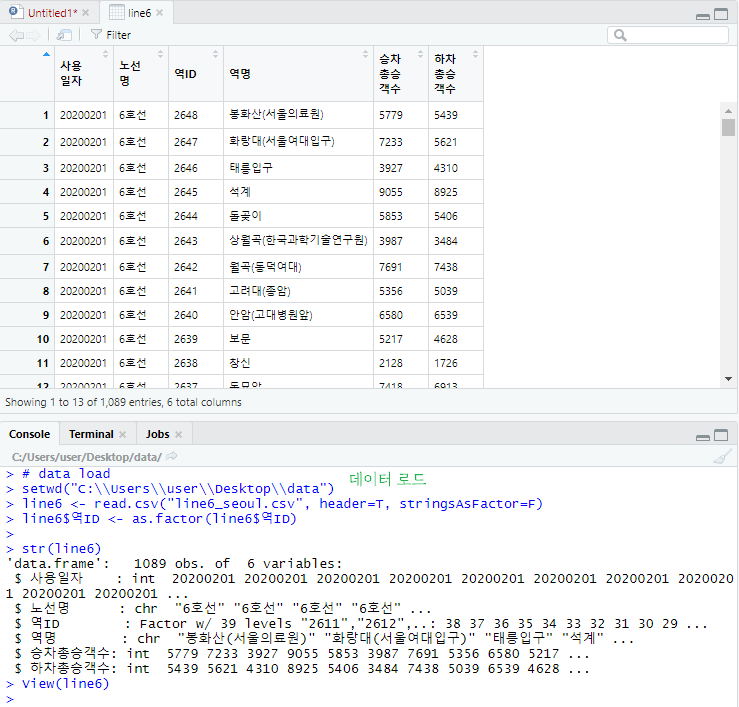 line6 <- read.csv("line6_seoul.csv", header=T, stringsAsFactor=F)