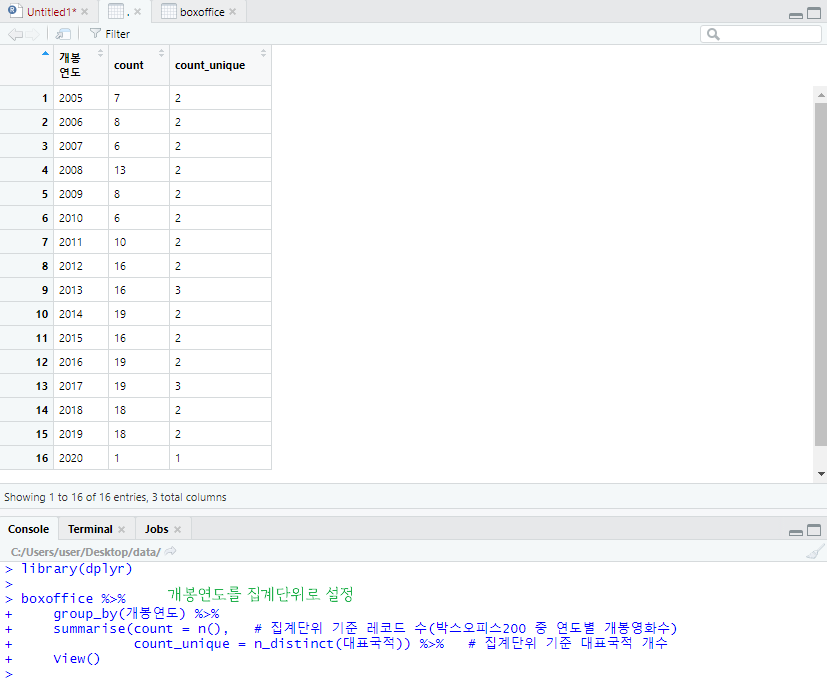 summarise(count = n(), # 집계단위 기준 레코드 수(박스오피스200 중 연도별 개봉영화수)
