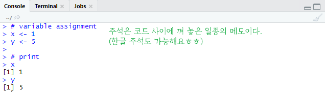 또 변수에 값을 지정할 때는 <- 기호를 사용하는데 이를 배정(assignment) 기호라고 한다.