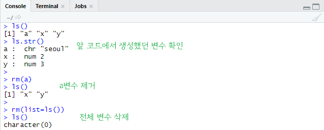 변수의 삭제는 rm(변수명)이며, 작업공간 전체 변수를 삭제하는 방법은 rm(list=ls()) 코드를 이용하면 된다.