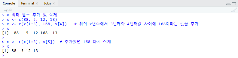 x <- c(x[1:3], x[5]) # 추가했던 168 다시 삭제