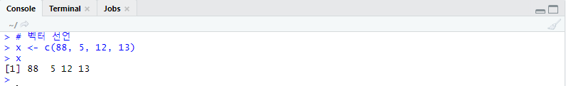 벡터를 생성할 때는 값을 바로 넣어주면 되고, 여러 개의 값을 넣어줄 때는 c( ) 연결함수를 통해 생성할 수 있다.