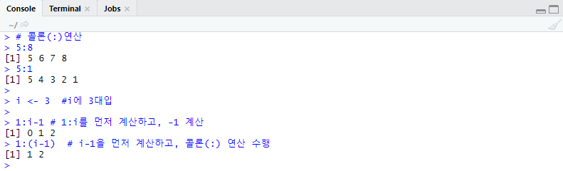 1:(i-1) # i-1을 먼저 계산하고, 콜론(:) 연산 수행