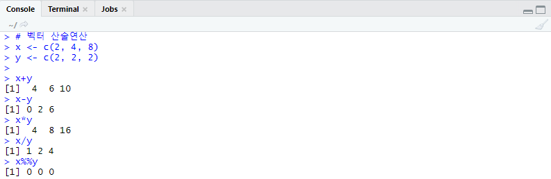 벡터가 두개 이상일 때 벡터간에도 덧셈과 뺄셈 등 산술연산을 할 수 있다.
