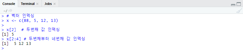 벡터 안에 값이 여러 개 일때 특정 위치에 있는 값이 무엇인지 확인해야 할 경우에 사용한다. 연산자 [ ]를 이용한다.