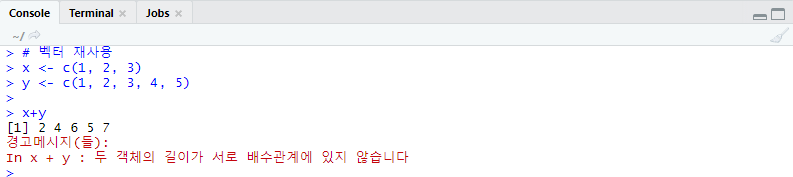 길이가 다른 두 벡터를 산술연산한다면, 두 길이를 같게 해주기 위해 길이가 짧은쪽 벡터를 처음부터 다시 재사용해서 긴쪽 벡터에 맞춰준다.