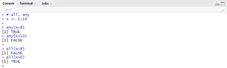 - all() 연산자는 괄호안에 조건을 주고, 벡터 내 모든 인자 값이 조건을 충족하는지(모든 값이 True) 확인하는 것이다.