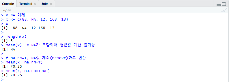 - NA가 포함되어있는경우에는 계산이 불가능하므로 na.rm=T를 설정해주어 NA값을 무시하고 계산하도록 할 수 있다.