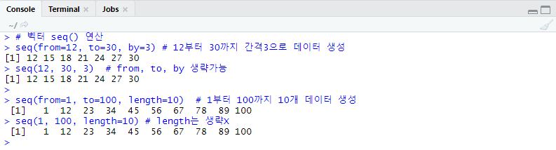 - seq( )의 from에는 시작값, to에는 끝값을 입력한다.
