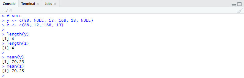 y <- c(88, NULL, 12, 168, 13, NULL)
