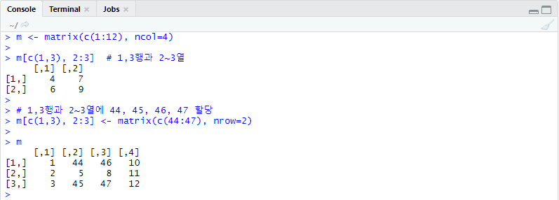 인덱싱을 이용해 부분행렬에 값을 새로할당하는 것도 가능하다.