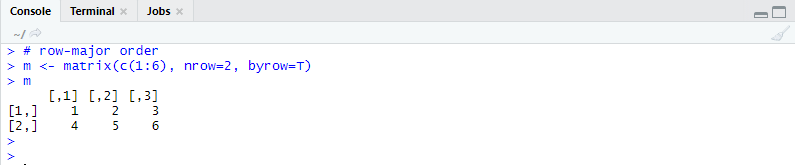 열 우선 배열을 행 우선 배열(Row-major order)로 바꾸고 싶을 때는 byrow=T 옵션을 사용하면 된다.