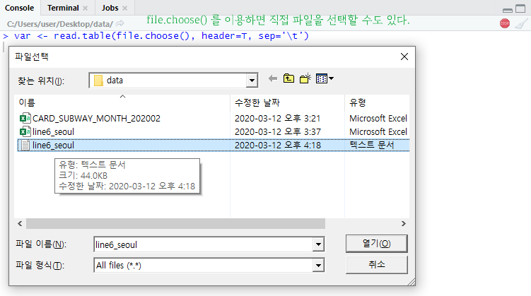 파일명을 입력하기 싫을 때는 read.table(file.choose(). header=T, sep='구분자') 로 불러올 수도 있다.